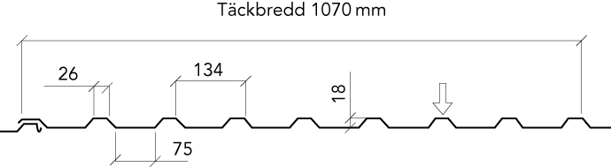 TR18 är en takprofil med en vågs överlapp och kapilärrilla,vilket ger en täckbredd på 1070 mm.